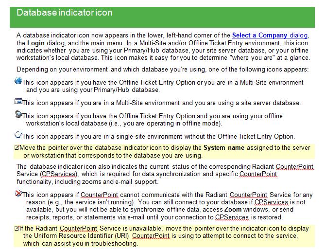 Icon Key for Database Indicator on NCR Counterpoint Login / Select a Company screen 418 November 11, 2024 4436 Summary: Icon Key for Database Indicator on NCR Counterpoint Login / Select a Company screen Solution: